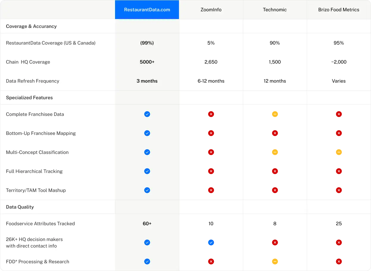 See how RestaurantData.com outperforms every competitor in data quality, coverage, and specialized features.