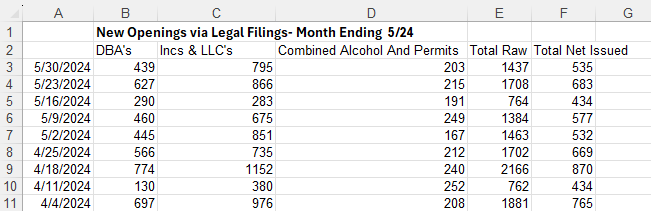| Weekly new restaurant opening location counts of all types, sizes and styles throughout the U.S.April and May 2024.Total Raw E = All filings types, columns B+C+D. Total Net Issued= Post research vetting-removing duplicates and erroneous filings. |