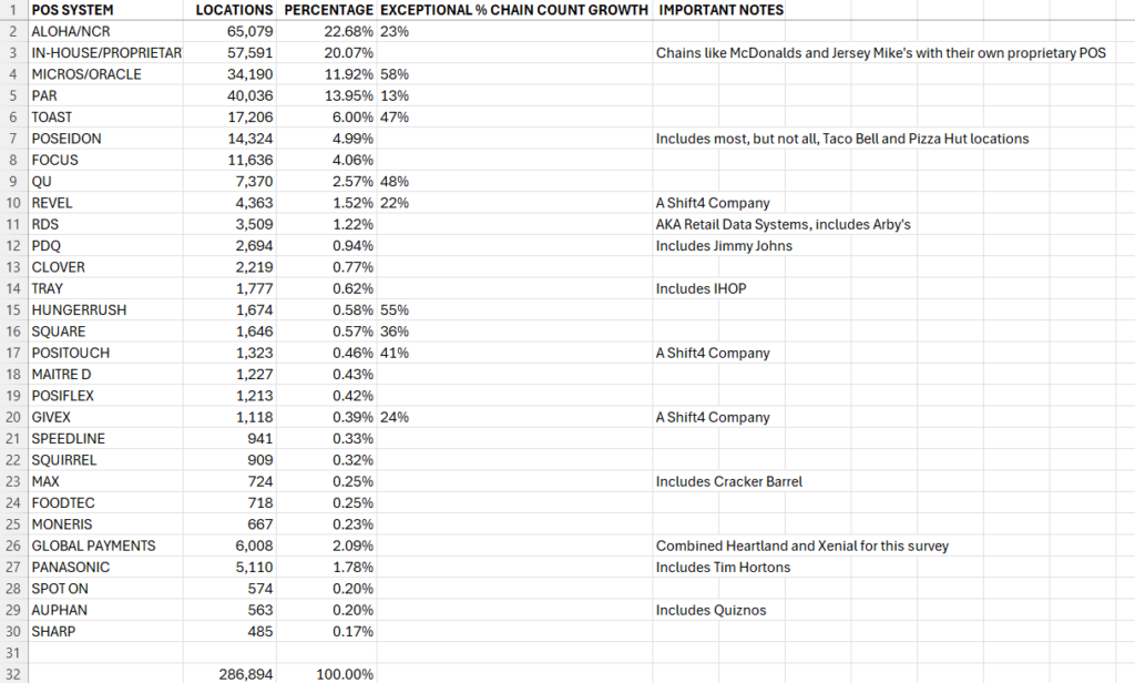 There was significant Enterprise growth in the following POS providers: Aloha, Micros, PAR, Toast, QU, Revel, Hungerrush, Square, Positouch, and Givex. Shift4 is the parent owner of Revel, Positouch and Givex.